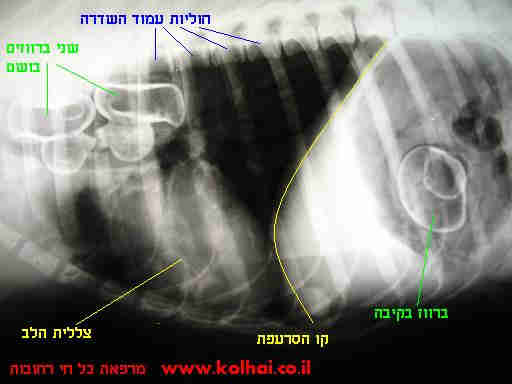 כלבה בת 4 שנים שהגיעה למרפאת "כל חי" לאחר שבוע של הקאות. בצילום הרנטגן ניתן לראות בושט שני ברווזי משחק תקועים קדמית ללב וכן ברווז אחד שעבר לקיבה. הטיפול בכלבה כלל דחיפת הברווזים מהושט לקיבה בעזרת אנדוסקופ ולאחר מכן ניתוח לפתיחת הקיבה והוצאת הברווזים.