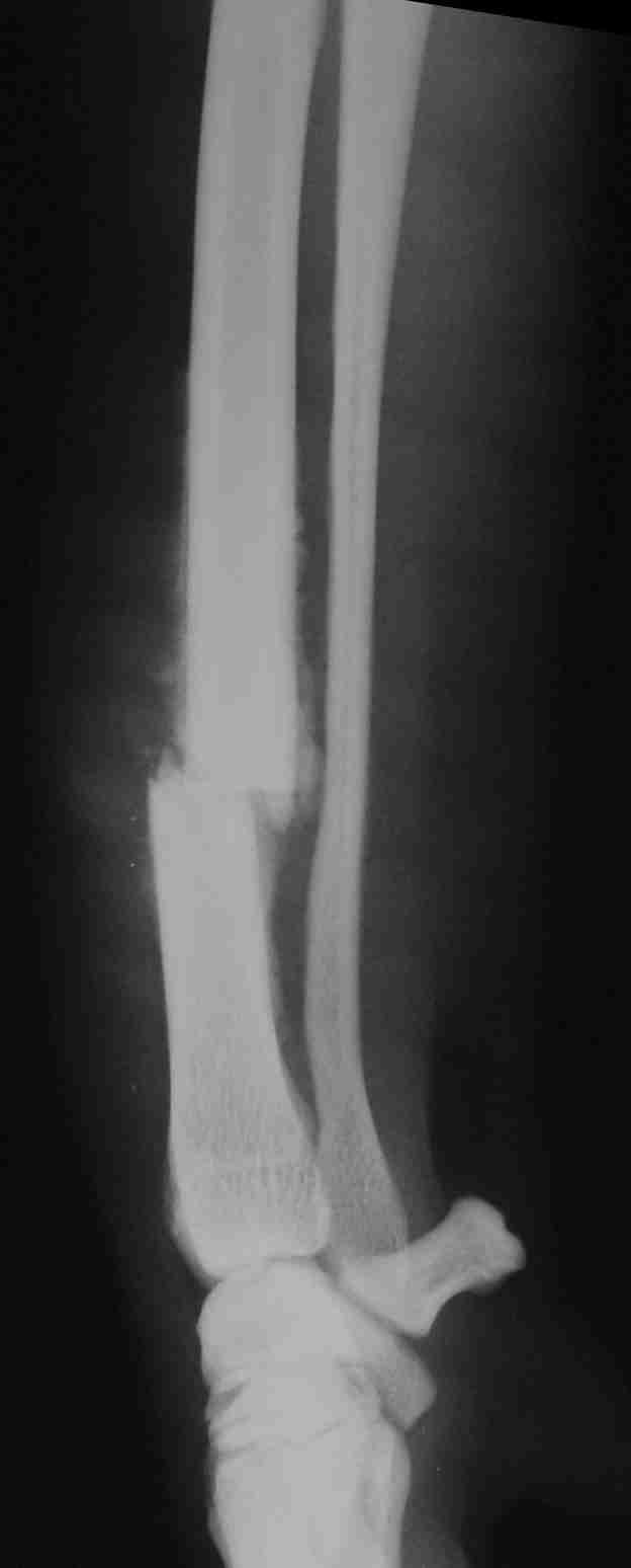 כלב שהגיע למרפאה עם תלונה של צליעה על רגל קדמית במשך מספר שבועות. בצילום הרנטגן ניתן לראות שעצם האמה נשברה והחל תהליך עצמי של קיבוע השבר ע"י רקמות הגוף – נראה כעננות בהירה סביב לאזור השבר. ייתכן שאם הכלב היה מגיע בזמן הפגיעה, ניתן היה לקבע את הרגל בצורה טובה יותר. נסיון לקבע את הרגל טוב יותר בשלב כזה – דורש שבירה מחודשת של העצם.